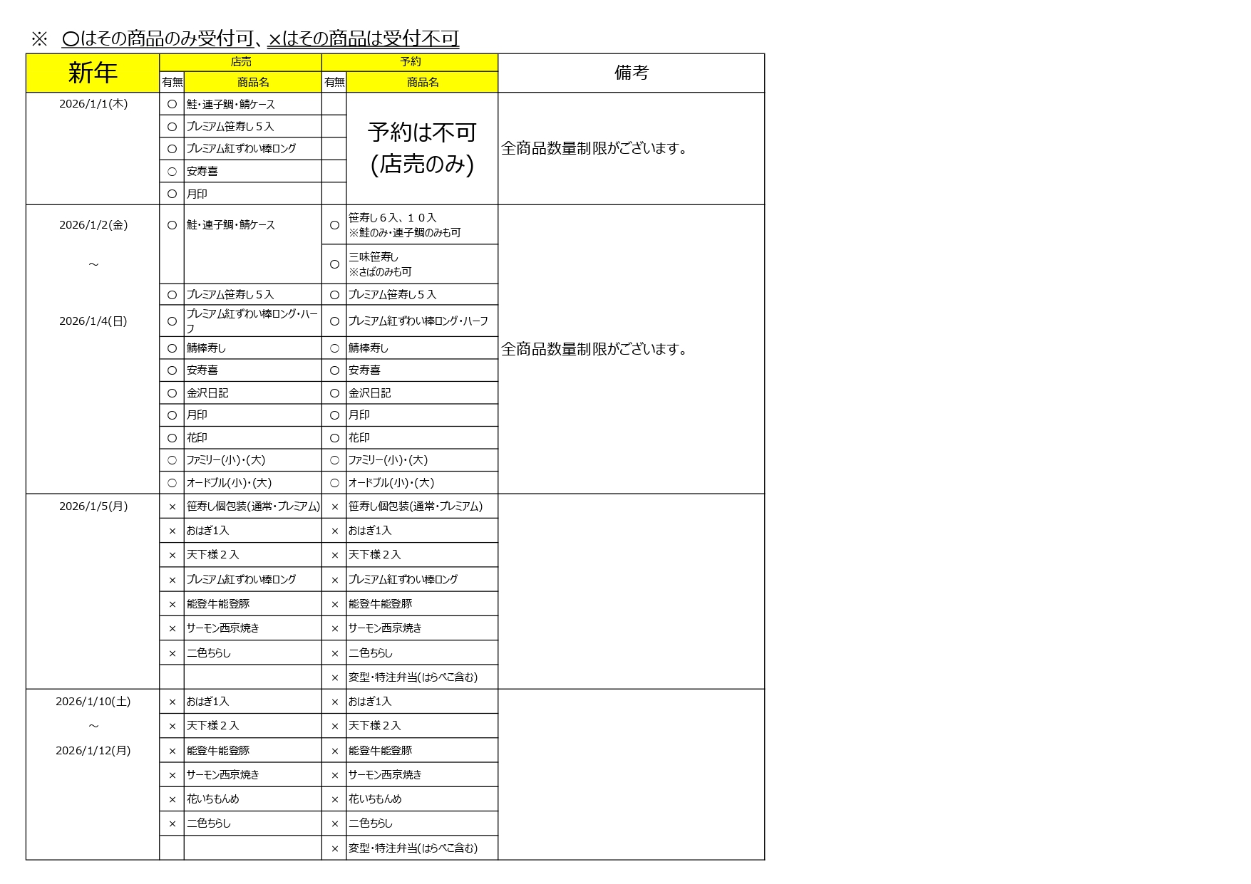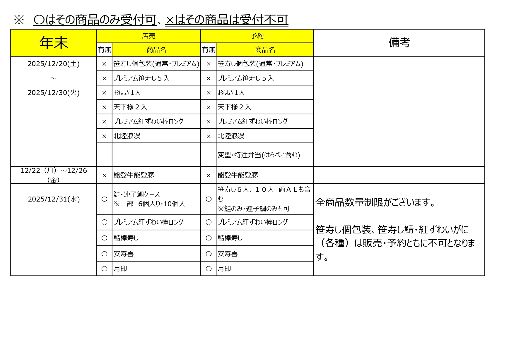 【商品 情報】年末年始の販売商品、予約受付終了日、配送休業日、宅配休業日のご案内